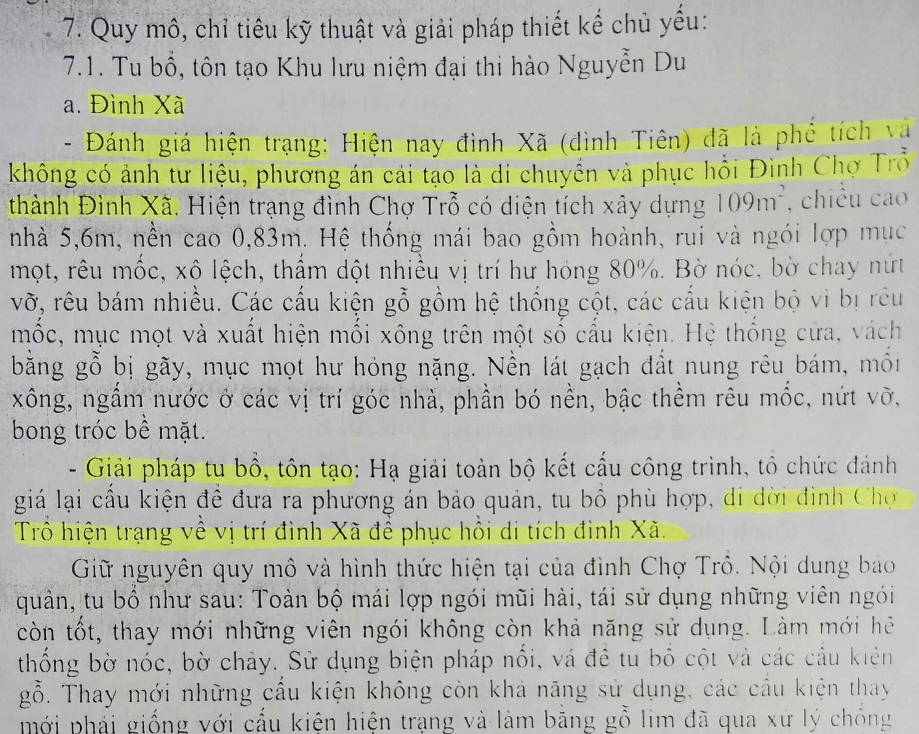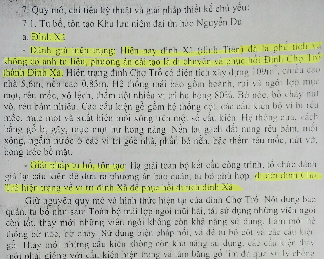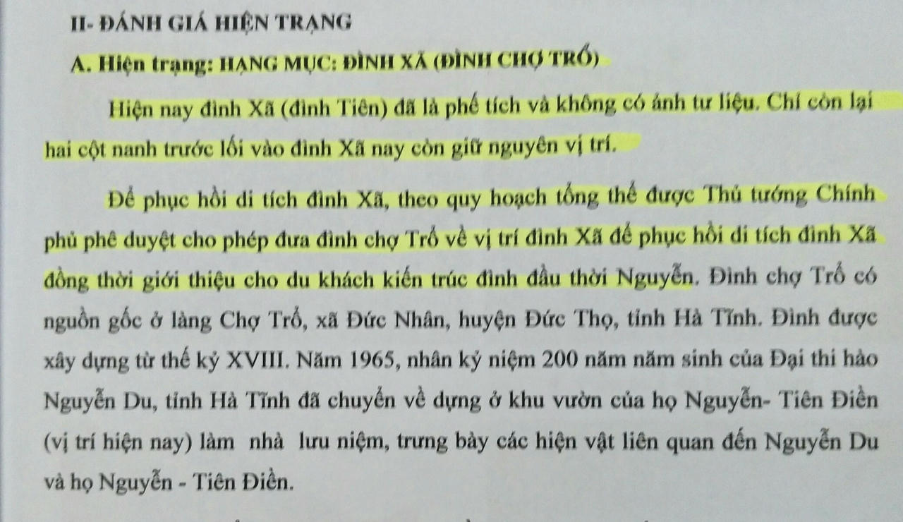Quyết định (QĐ) số 1264/QĐ-UBND ngày 06/5/2019 của UBND tỉnh Hà Tĩnh về Phê duyệt Thiết kế bản vẽ thi công Dự án Tu bổ, tôn tạo các di tích gốc và xây dựng cơ sở hạ tầng KLN Nguyễn Du (giai đoạn 1) nêu: “Hiện đình Xã (đình Tiên) đã là phế tích và không có ảnh tư liệu, phương án cải tạo là di chuyển và phục hồi đình Chợ Trổ thành đình Xã”.