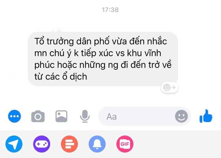 Chị Ánh Nguyệt (Dịch Vọng) cho biết từ sáng sớm, tổ trưởng tổ dân phố đã đến gõ cửa từng nhà để nhắc nhở về phòng chống dịch Covid-19, cùng với đó là nhắc nhở tất cả mọi người không tiếp xúc với khu Vĩnh Phúc, Thanh Hoá và cả những người đi-về 2 vùng trên: "Tôi nghe mà sợ, đến diễn thuyết một bài dài trước cửa nhà chúng tôi. Tra hỏi xem quê quán của tôi ở đâu và "hỏi thăm" xem lịch trình gần đây của chúng tôi đi những nơi nào. Khi nghe tôi trả lời quê ở Nam Định và từ tết chưa đi đâu khỏi Hà Nội thì cô tổ trưởng mới yên tâm ra về."