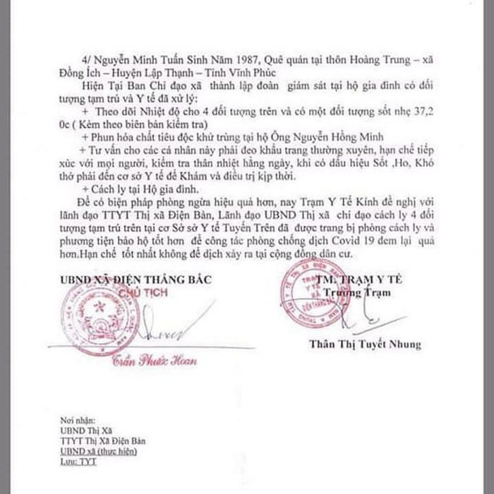 Trước đó, cộng đồng mạng được dịp hoang mang khi báo cáo của TYT xã Điện Thắng Bắc (Thị xã ĐIện Bàn - Quảng Nam) dùng từ "4 đối tượng" để chỉ 4 người đến từ huyện Lập Thạch và huyện Sông Lô của tỉnh Vĩnh Phúc tạm trú ở Quảng Nam.