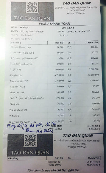 (PLO) - Ngày 25/11, sau khi kết thúc bữa ăn tối, cả 6 khách hàng cùng “phát sốt” khi nghe nhân viên nhà hàng Tao Đàn Quán, số 2 Lý Thường Kiệt, quận Hoàn Kiếm, Hà Nội cho biết hóa đơn của bữa ăn có “dưa chuột chẻ VIP” hết 25.543.100đ.