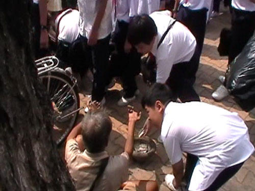 Đến giờ tan trường, ông lại đến trước cổng trường để chiếc nón xuống xòe tay xin tiền của học sinh. Các em rất ngây thơ lần lượt bỏ tiền vào chiếc nón, có em cho đến 10.000 đồng. Cứ thế, lâu lâu ông lại lấy tiền bỏ vào giỏ xách.