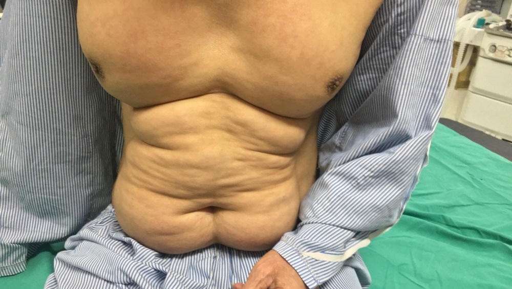 Nam bệnh nhân 50 tuổi trú tại huyện Yên Bình (Yên Bái) vào viện với nhiều khối u mỡ vùng gáy. U to nhất kích thước 15cm x 20cm, vùng mặt cổ biến dạng,  vùng bụng có nhiều khối mỡ.