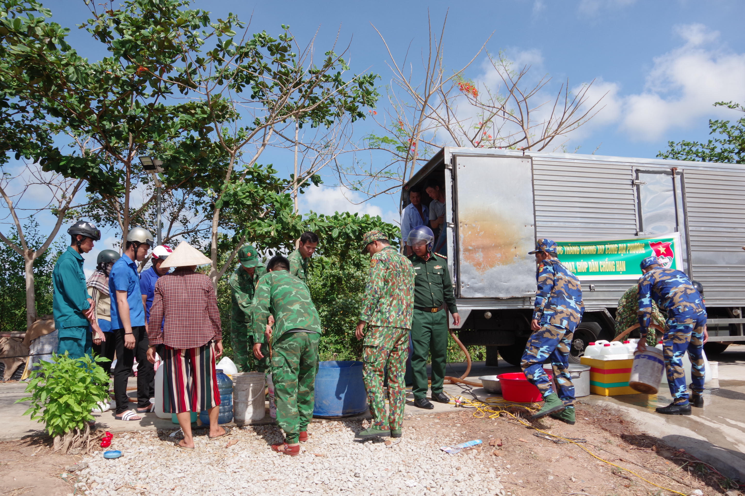 Đơn vị vận chuyển hơn 10.000 lít nước sinh hoạt từ trạm cấp nước sinh hoạt đến các hộ dân, hộ người cao tuổi, gia đình chính sách, cán bộ chiến sĩ Bộ đội Biên phòng dùng xe gắn máy, xe cơ giới khác chở đến từng hộ gia đình.