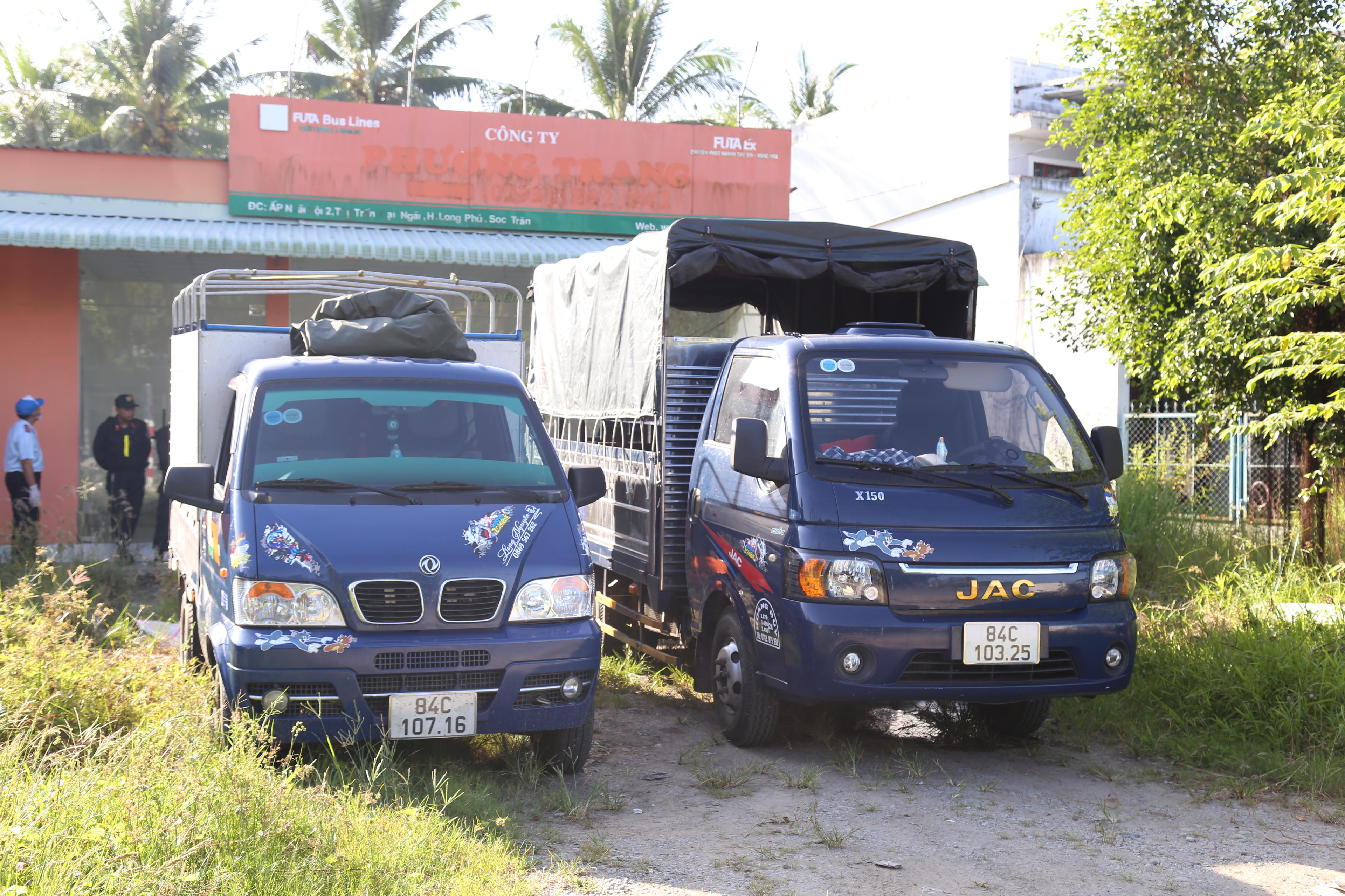 2 chiếc xe ô tô tải vận chuyển 173 heo con từ tỉnh Trà Vinh sang tỉnh Sóc Trăng. Ảnh: Anh Tuấn |