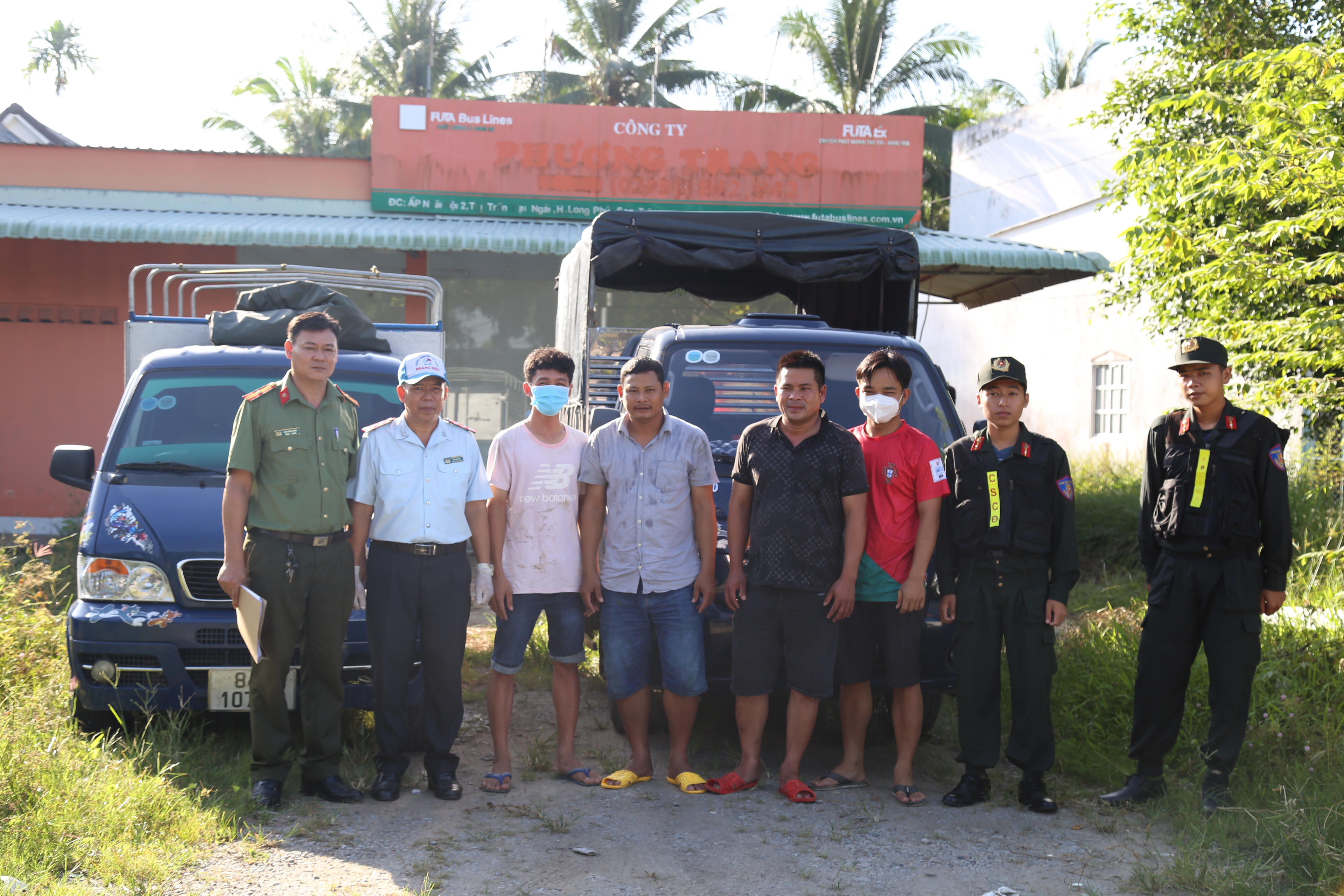 Các đối tượng và phương tiện vận chuyển cùng tang vật tại hiện trường. Ảnh: Anh Tuấn |