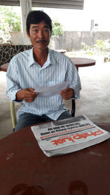 | Ông Trần Văn Long cầm trên tay tờ “thông báo” của UBNd tỉnh Sóc Trăng trả lời đơn khiếu nại của ông (?!) |