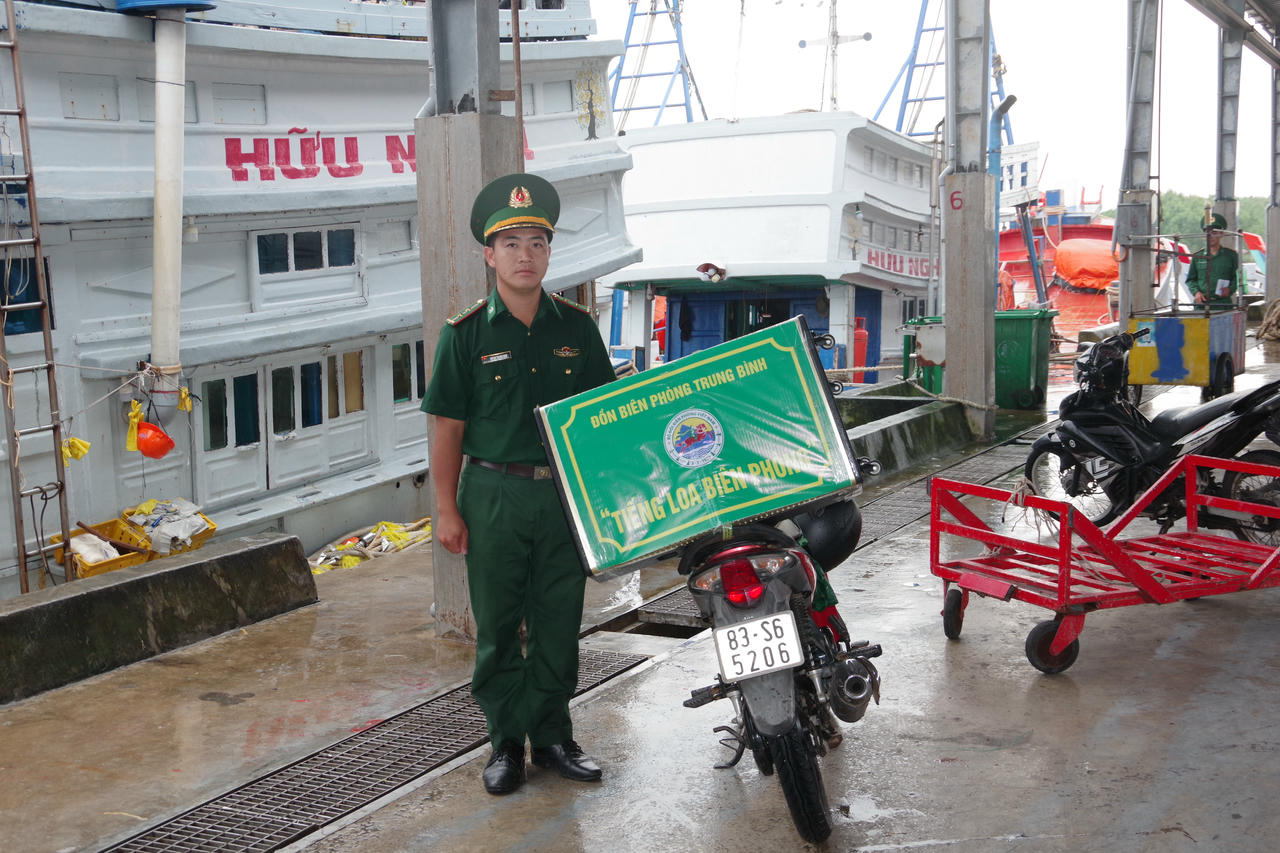 Đồn Biên phòng Trung Bình sử dụng mô hình “Tiếng loa Biên phòng” tuyên truyền tại cảng cá Trần Đề. Ảnh: Văn Long |