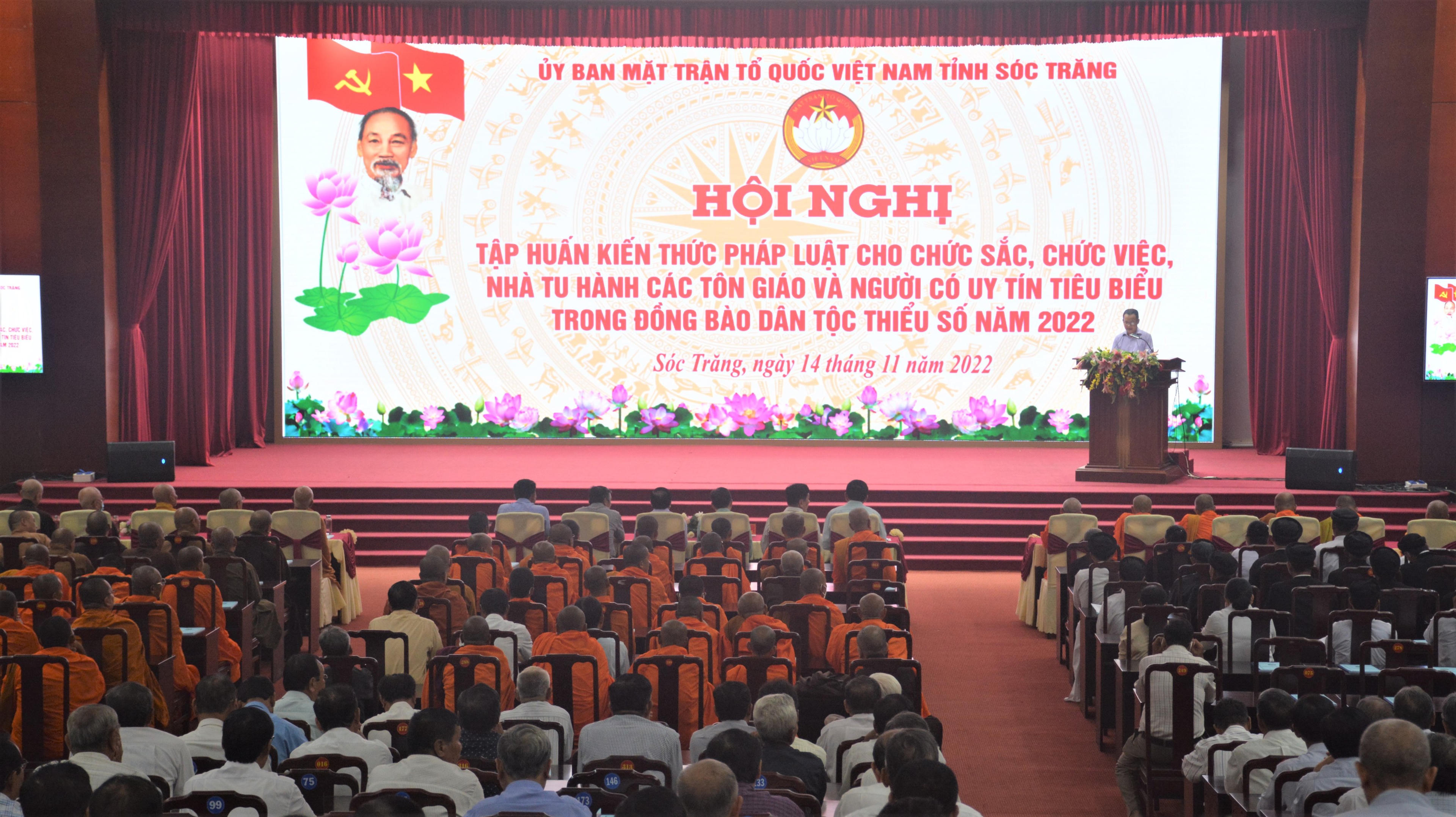 (PLVN) - Ngày 14/11, Ban Thường trực Ủy ban MTTQ Việt Nam tỉnh Sóc Trăng tổ chức hội nghị tập huấn kiến thức pháp luật cho 350 vị là chức sắc, chức việc, nhà tu hành các tôn giáo và người có uy tín tiêu biểu trong đồng bào dân tộc thiểu số trên địa bàn tỉnh.