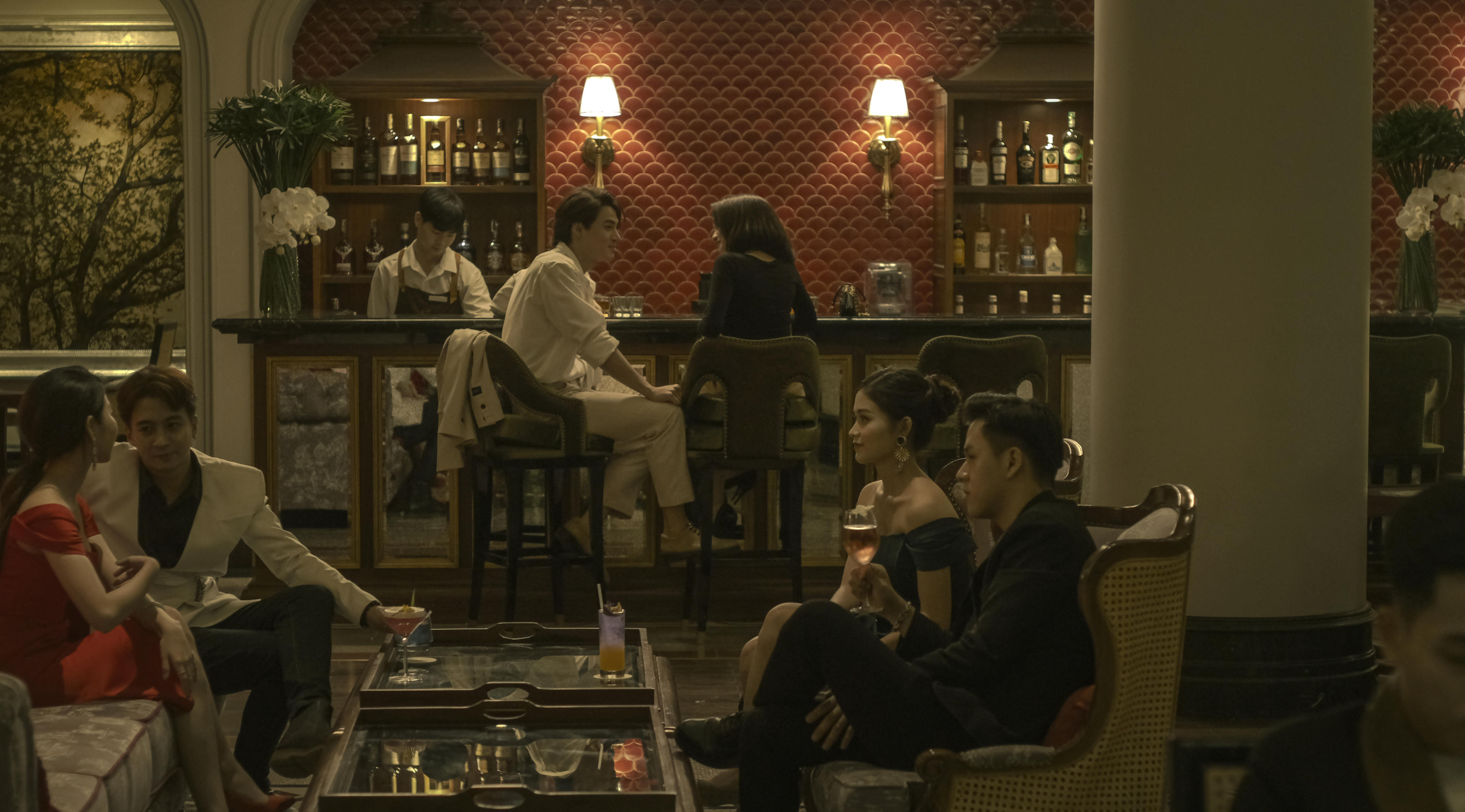 Phần sàn lát gạch hoạ tiết cổ và các chi tiết nội thất kiêu kỳ được tôn vinh một cách hoàn mỹ dưới ánh sáng vàng của những chiếc đèn tường, đèn bàn mang màu sắc cố đô – đây đích thực là điểm hẹn hò hoàn hảo của các cuộc đời vương giả. Trong không gian kiến trúc Pháp cầu kỳ đó, cô út nhà họ Lý – Lý Linh (Kaity Nguyễn thủ vai) xuất hiện đúng chuẩn phong cách “tiểu thư con nhà danh giá”, sánh đôi cùng Jonathan Vĩnh Thụy (Khương Lê thủ vai) cực kỳ lãng tử chuẩn công tử nhà giàu.