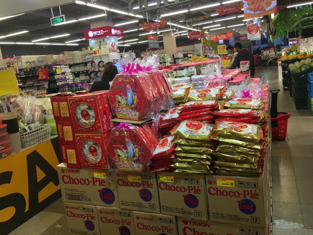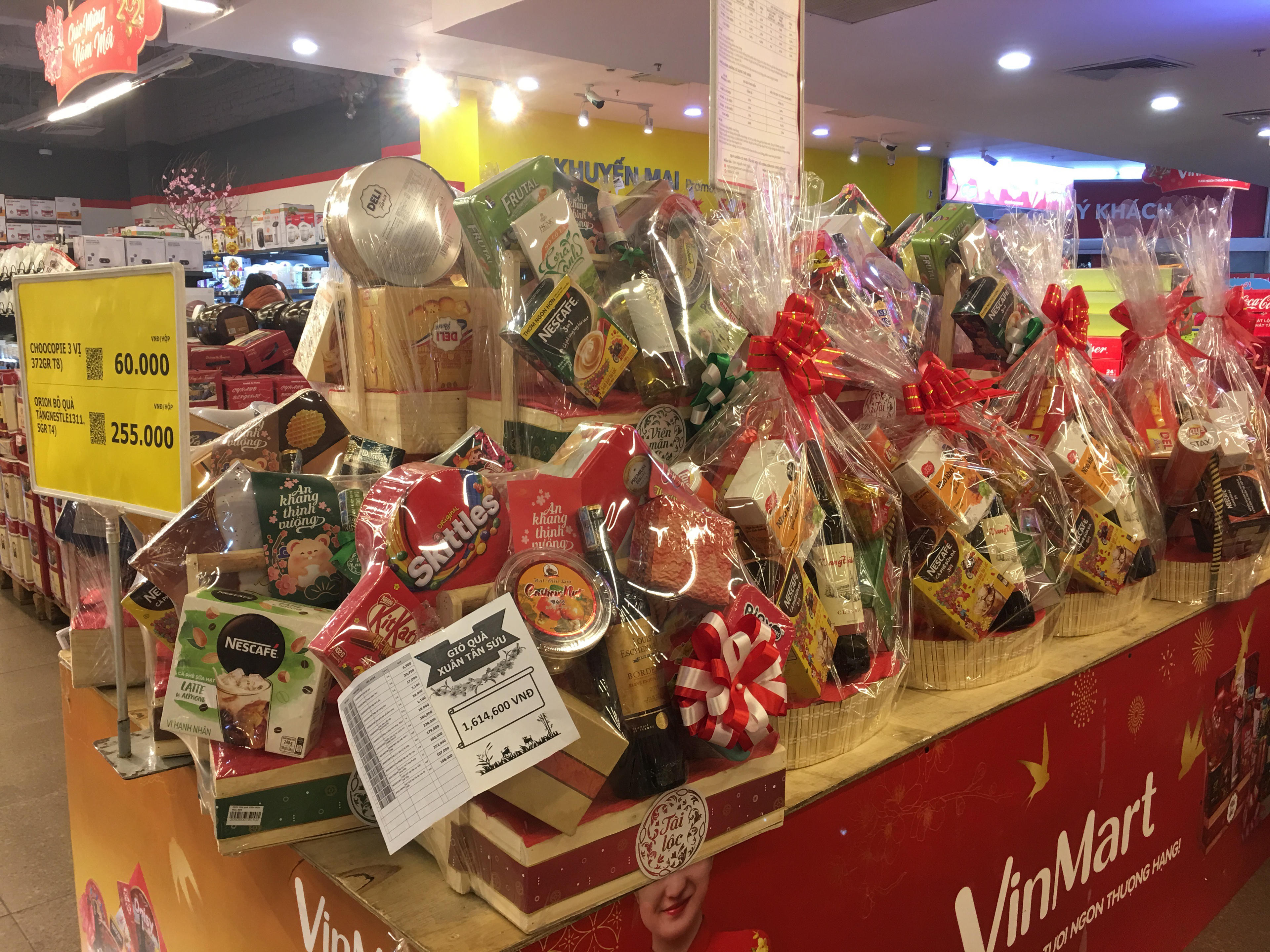 Tại hệ thống siêu thị VinMart & VinMart+, nhà bán lẻ dành ra một gian hàng ngay tại trung tâm để bày bán các sản phẩm quà, bánh kẹo Tết. Năm nay, nhà bán lẻ Masan đã ra mắt 3 nhóm sản phẩm giỏ quà tặng Tết phổ thông với các mức giá từ 399.000 đồng/giỏ, 499.000 đồng/giỏ và 699.000 đồng/giỏ.
