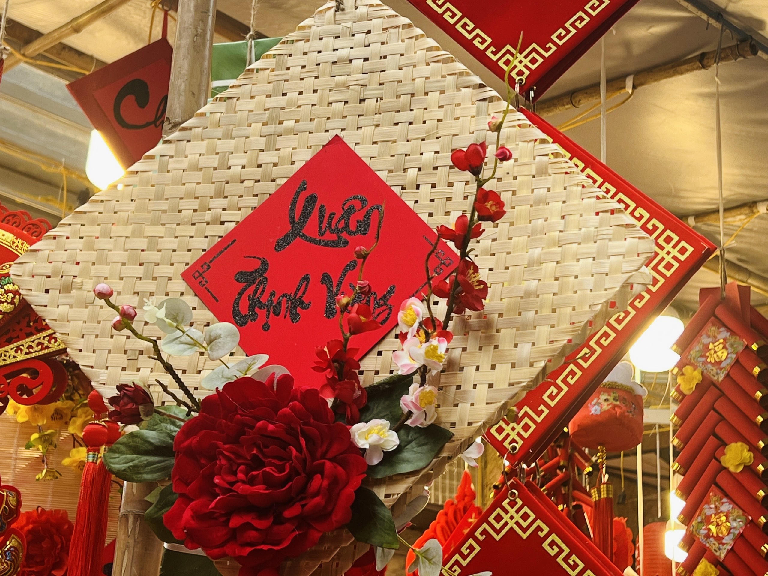 Những món đồ trang trí truyền thống với nhiều mẫu đa dạng như: hoa đào, hoa mai, mẹt tre, mành tre, câu đối đỏ, dây pháo, bánh chưng, bánh tét, lì xì đỏ... Tùy vào chất liệu và kích thước mà mỗi món phụ kiện sẽ có giá dao động từ 50.000 đến 500.000 đồng.