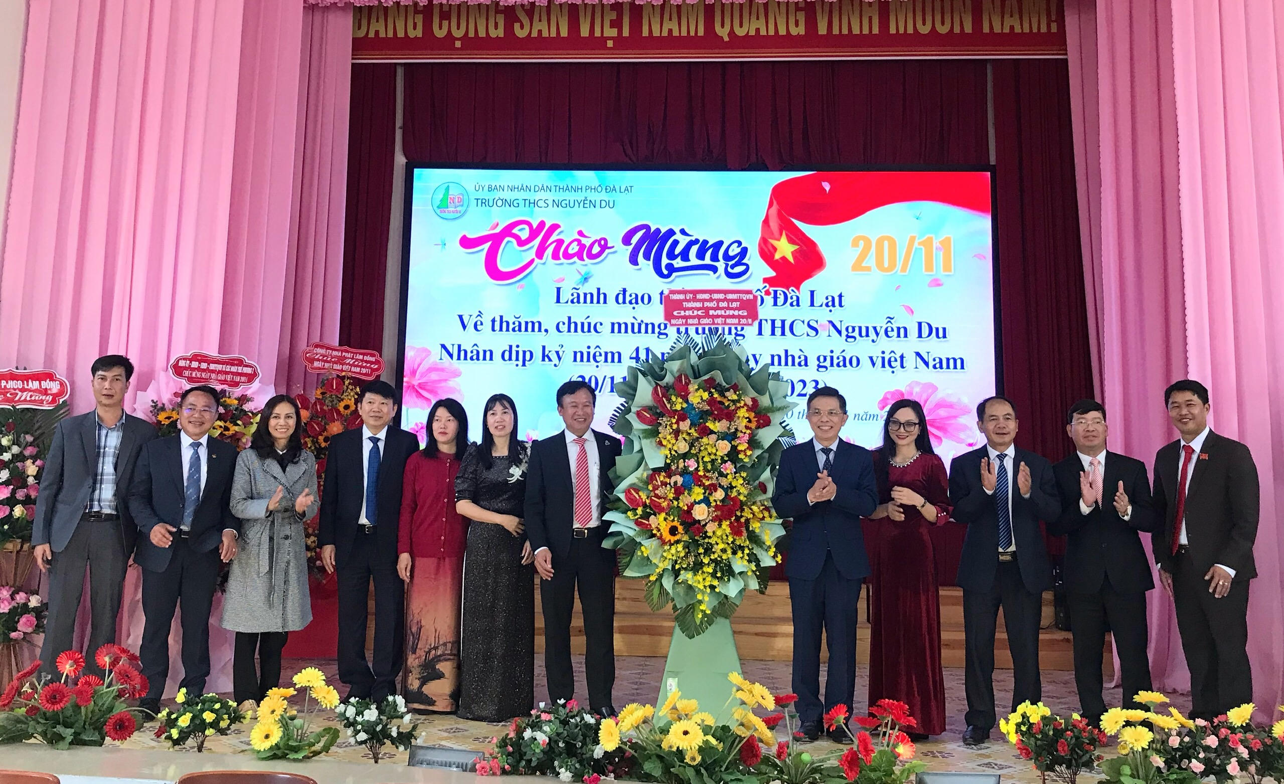 Ông Đặng Trí Dũng - Bí thư Thành uỷ Đà Lạt (số 5 từ phải qua) tặng hoa chúc mừng cán bộ, giáo viên Trường THCS Nguyễn Du. |