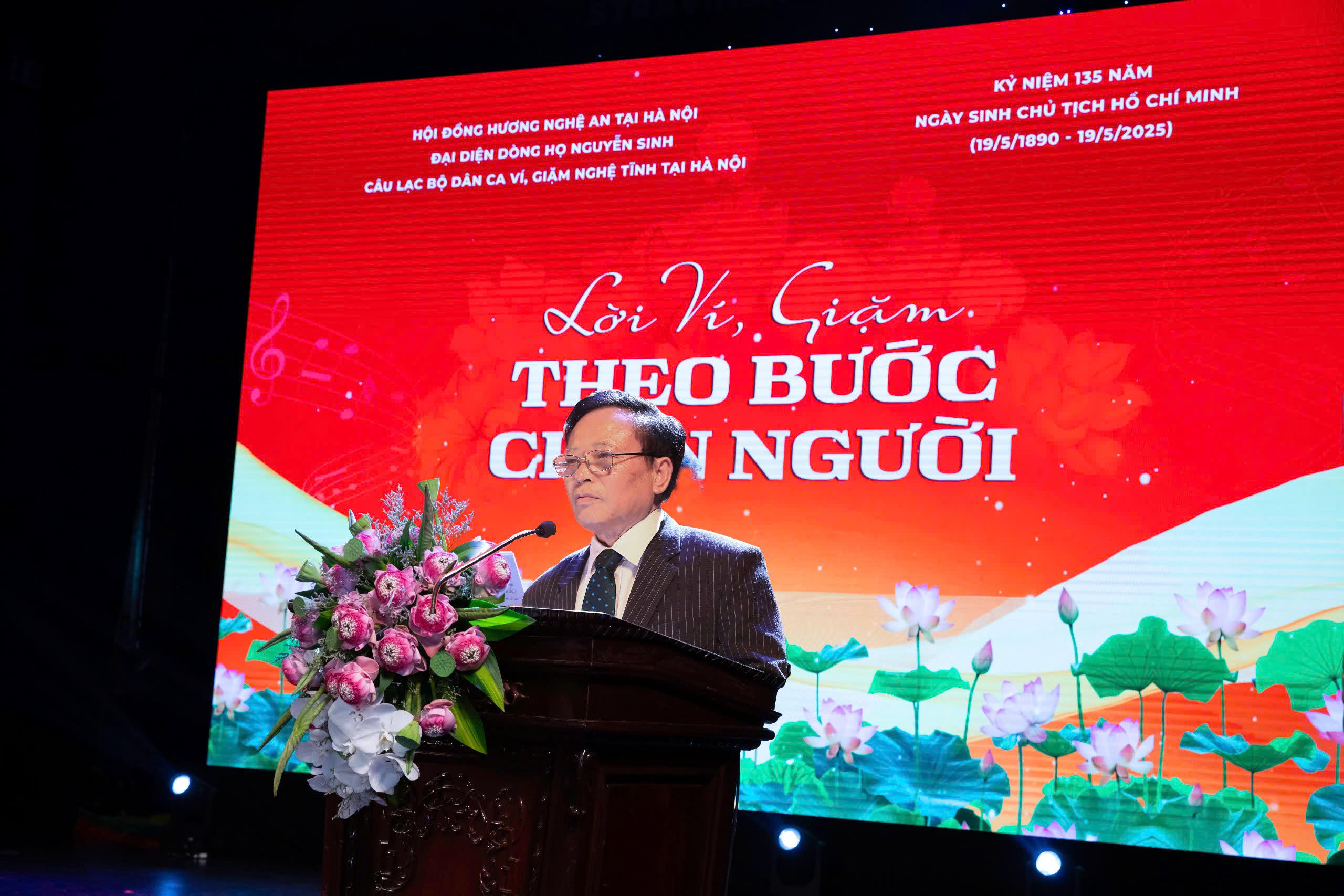 Phát biểu khai mạc chương trình, Thiếu tướng, Nhà văn Nguyễn Hồng Thái - Phó Chủ tịch Hội đồng hương Nghệ An tại Hà Nội xúc động chia sẻ: “Tháng Năm về, lòng người Việt Nam cùng hướng về Chủ tịch Hồ Chí Minh, vị Cha già dân tộc, Người đã để lại cho hậu thế không chỉ một sự nghiệp cách mạng vĩ đại mà còn là một trái tim yêu thương vô bờ bến với quê hương, đất nước và nhân loại.”