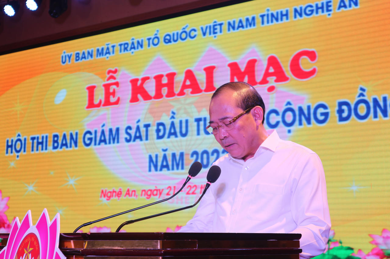 Phát biểu tại hội thi, ông Hoàng Công Thủy - Phó Chủ tịch Uỷ ban MTTQVN; bà Võ Thị Minh Sinh - Chủ tịch Ủy ban MTTQ tỉnh Nghệ An ghi nhận, đánh giá cao hoạt động của Ban giám sát đầu tư của cộng đồng ở cơ sở; sự chủ động, cố gắng, nỗ lực của MTTQ các cấp trong tỉnh.