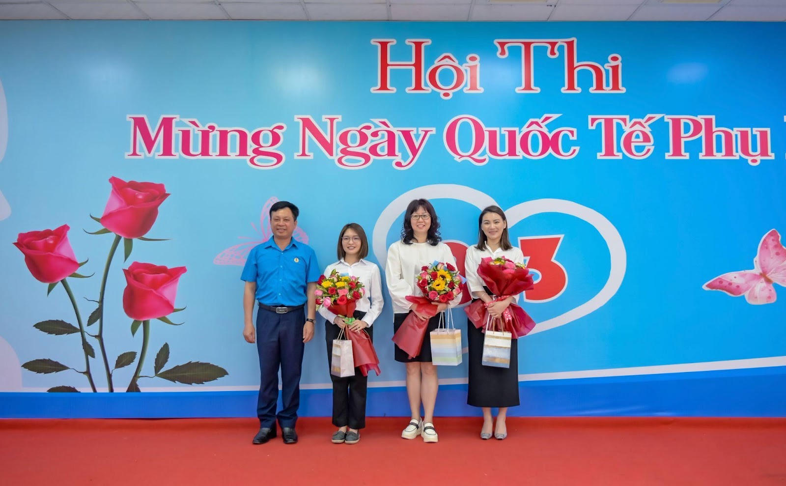 Ông Phạm Trung Thuyên - Chủ tịch Công đoàn (áo xanh) trao hoa và quà cho các nữ cán bộ nhân viên nước ngoài