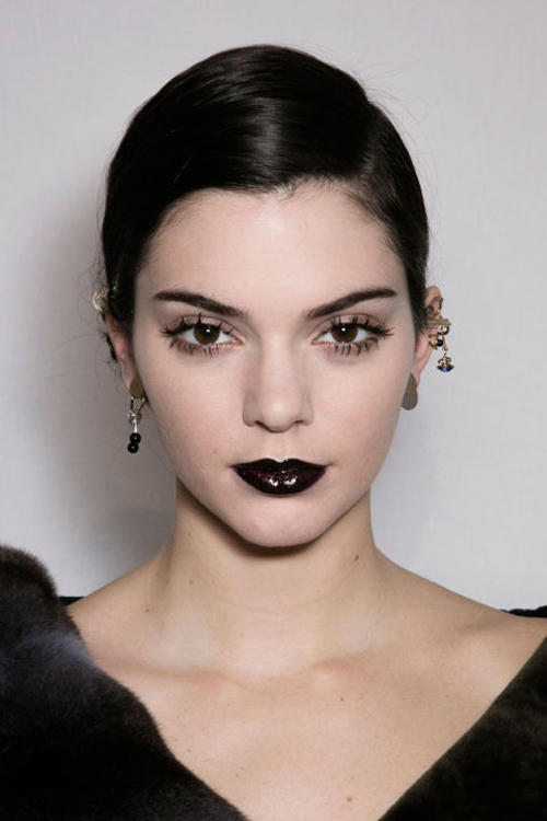 Chân dài Kendall Jenner xuất hiện trong show thời trang của Dior với làn môi đen bóng như mực. |