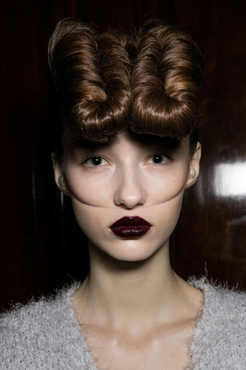 Nhà mốtGareth Pugh chọn màu son đỏ tía bóng đi cùng kiểu tóc búi đỉnh đầu lạ mắtcho dàn mẫu. |