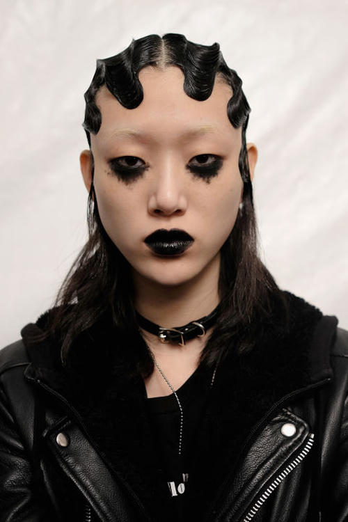 Marc Jacobs giữ vững tinh thần độc và lạ với kiểu trang điểm quầng mắt đen nhòe nhoẹtvà làn môi đen bóng. |