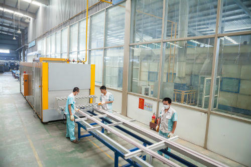Theo quy trình, các cuộn film vân gỗ được đưa vào máy cắt theo kích thước phù hợp để dán vào profile nhôm và chuyển vào máy hấp, điều chỉnh nhiệt độ đủ để tạo ra vân gỗ trên thanh profile nhôm. Dây chuyền sơn vân gỗ công nghệ cao đảm bảo cho sản phẩm không bị trầy xước bề mặt kể cả trong trường hợp có va đập mạnh, chống bám bụi, bền đẹp.