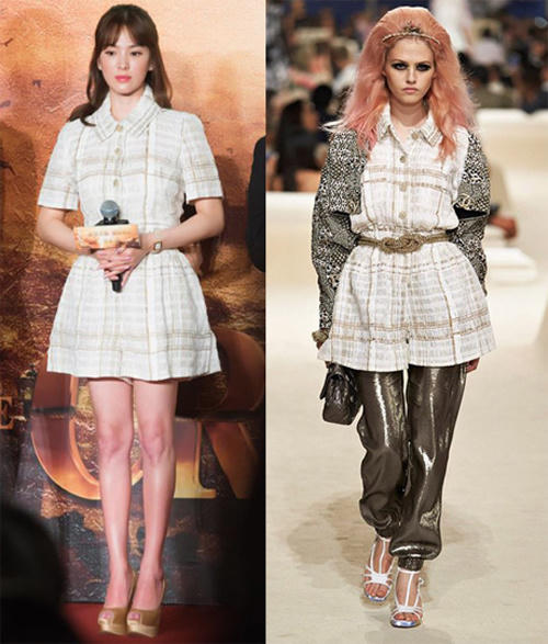 Từ khi vào làng giải trí, Song Hye Kyo trung thành với phong cách thanh lịch, nhã nhặn. Cô thường biến tấu hàng hiệu để phù hợp phong cách của mình.