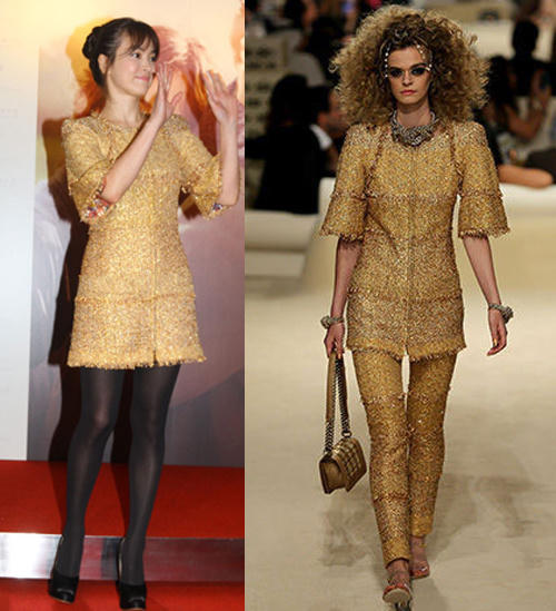 Tại một sự kiện ở Trung Quốc, nữ diễn viên chọn váy trắng chữ A kết hợp sơ mi của Chanel thay vì diện quần hoa cá tính như người mẫu (phải).