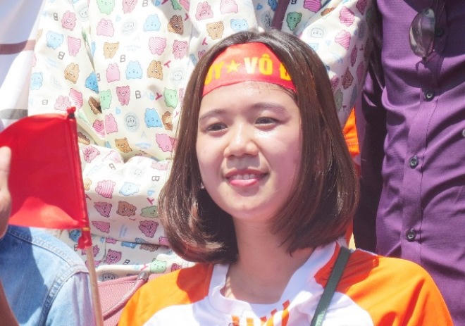 | Cổ động viên nữ của thuyền đua Mỹ Thủy với khuôn mặt duyên dáng, để đầu trần bất chấp trời nắng to để cổ vũ cho đội nhà... Ảnh: Trần Nguyên Phong |