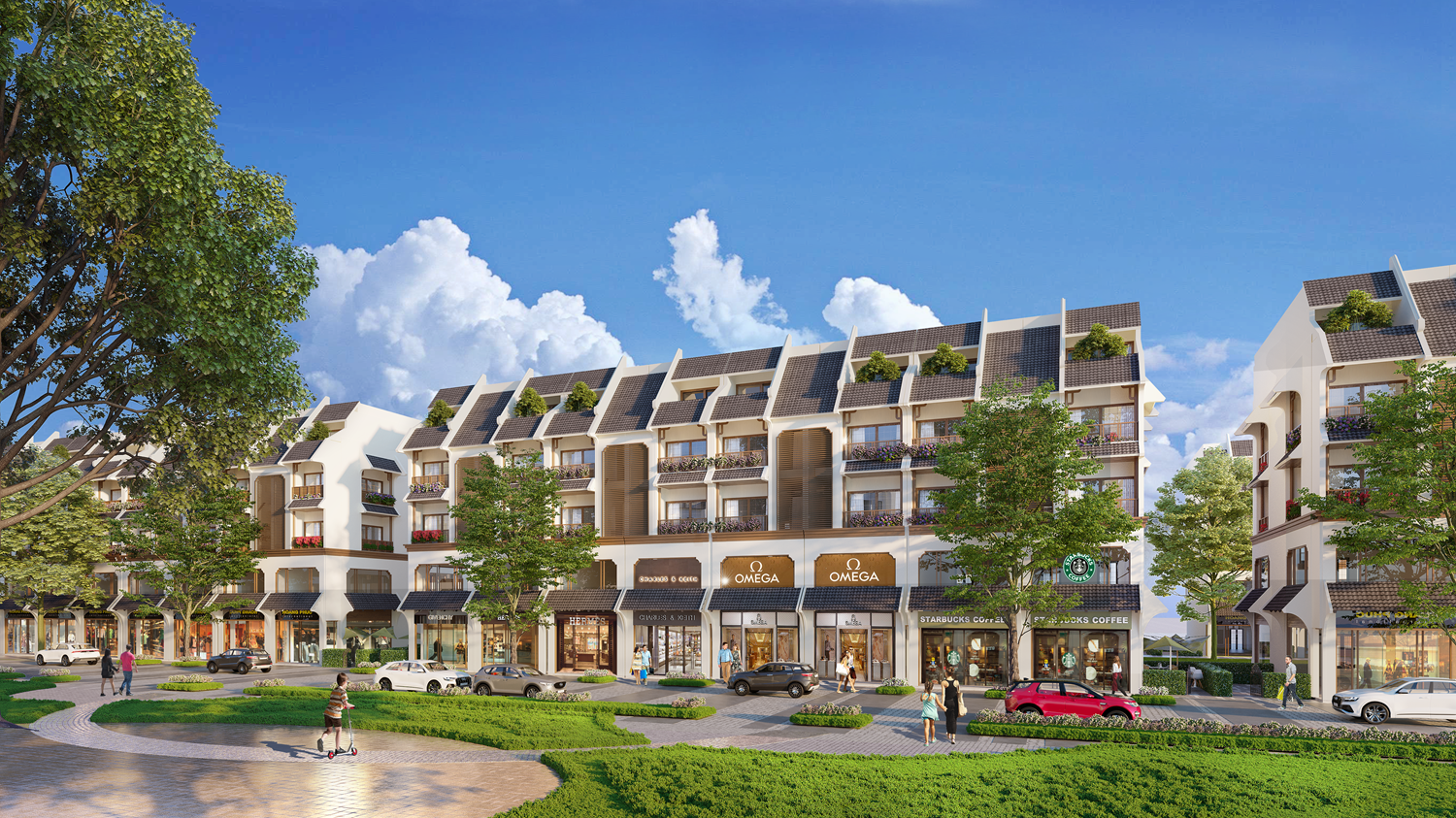 Các căn biệt thự, liền kề, shophouse có diện tích lớn từ 100 – 500m2, sân cỏ rộng, hàng rào chắn kiên cố. Mỗi ngôi nhà đều có ban công xanh mát với khoảng cách rộng 6 - 9m, thích hợp để gia chủ trang trí thành góc thư giãn. Sự kết hợp giữa kiến trúc và cảnh quan xung quanh tạo nên không gian sống tiện nghi, sang trọng và yên bình, lý tưởng cho những người có thu nhập cao.