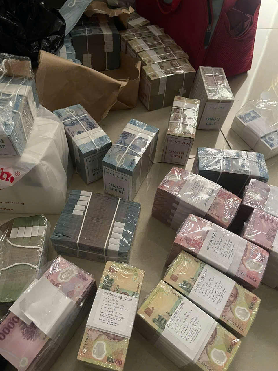Bên ngoài các cọc tiền mới thậm chí còn được các đối tượng dán thêm tờ niêm yết giới thiệu "nguồn gốc" từ "Ngân hàng Nhà nước Việt Nam". |
