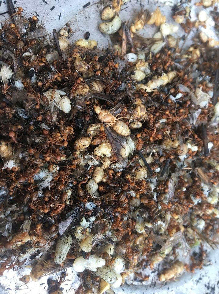 Vào một buổi sáng, khi đang phát những bụi cây rậm rạp, một người đàn ông bị mấy con kiến rơi từ trên cây xuống đốt vào cổ, ngẩng lên thấy hai tổ kiến vàng to đùng. Vài phút sau, tổ kiến đã được chặt xuống, hơ lửa trên tảng đá lớn cạnh đó. Vậy là chúng tôi mang về được đầy một cái mũ những con kiến vàng cho bữa trưa.