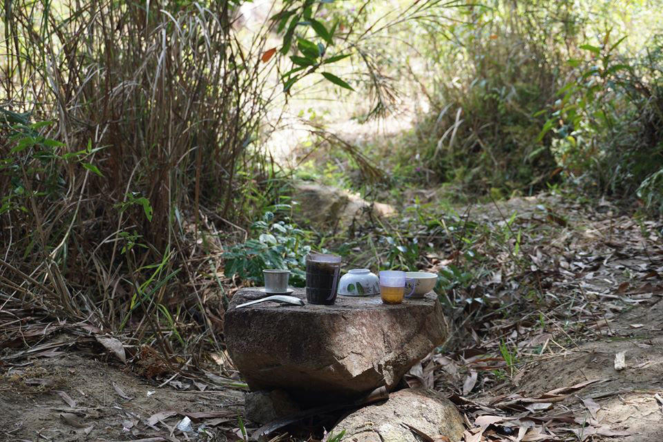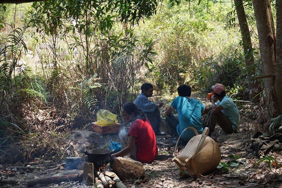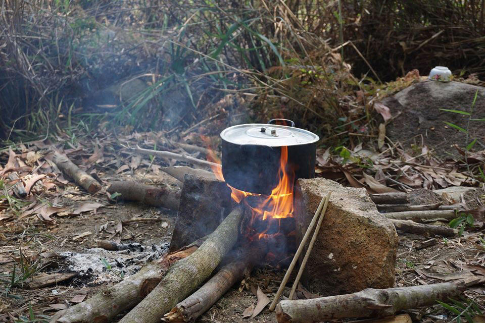 Lều trại, bếp lửa xuất hiện trước mắt tôi chỉ trong tích tắc. Người phụ nữ nhanh chóng tới đầu nguồn lấy nước nấu cơm. Một người đàn ông vác những hòn đá về kê bếp, hai người còn lại lật một tảng đá xuống làm bàn uống trà. Mọi thứ hoàn thành nhanh tới mức tôi chưa kịp làm gì, chỉ kịp đứng để sững sờ trước những kỹ năng ở rừng của người dân Raglay.