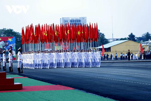Từ sân bay quân sự Biên Hòa (Đồng Nai), các máy bay trực thăng thuộc Trung đoàn Không quân 917, 916, 930 lần lượt cất cánh, tiến về khu vực trung tâm TP Hồ Chí Minh theo đội hình biên đội 3 - 4 - 3. Trên mỗi chiếc trực thăng là những lá cờ Tổ quốc, cờ Đảng rộng 20m² tung bay dọc sông Sài Gòn, phía dưới là không khí hừng hực tại bến Bạch Đằng, nơi pháo lễ sẵn sàng khai hỏa trong ngày trọng đại.