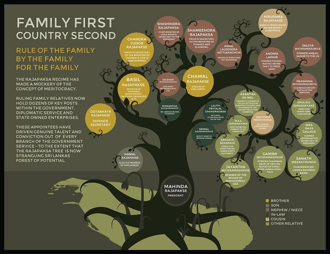 Với việc có người giữ những vị trí cao như vậy, nhiều người cho rằng gia tộc Rajapaksa đã thực sự trở thành thế lực kiểm soát mọi khía cạnh của cuộc sống của người dân Sri Lanka, biến chính phủ Sri Lanka trở thành một doanh nghiệp gia đình.