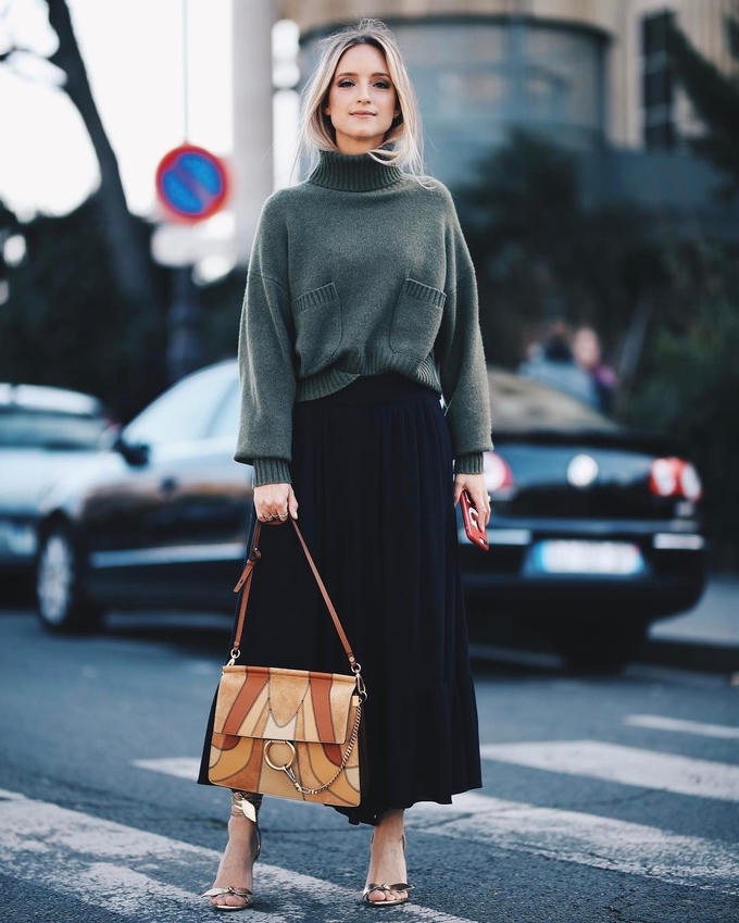 Cô kết hợp kiểu áo ấm này cùng chân váy maxi mềm mại.