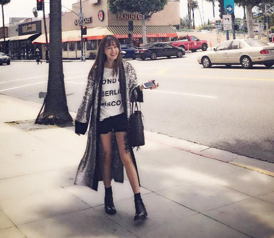 Trong khi đó, nữ diễn viên Lee Min Jung - bà xã tài tử Lee Byung Hun - sành điệu trên phố khi chọn áo khoác dáng dài sequin bạc nổi bật. Những món đồ còn lại khá cơ bản như áo thun trắng, quần shorts khoe đôi chân thon.