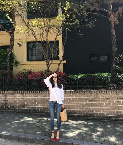 Nữ diễn viên Park Soo Jin dạo phố với trang phục đơn giản gồm áo sơ mi phối bèo nhún điệu đà, skinny jeans và giày quai ngang màu đỏ làm điểm nhấn. Cô cũng xách mẫu túi cói - món đồ điển hình của mùa hè.