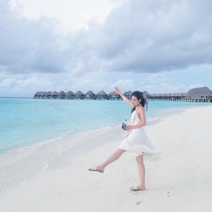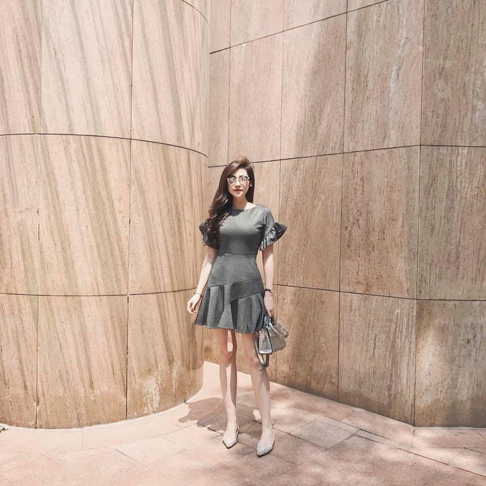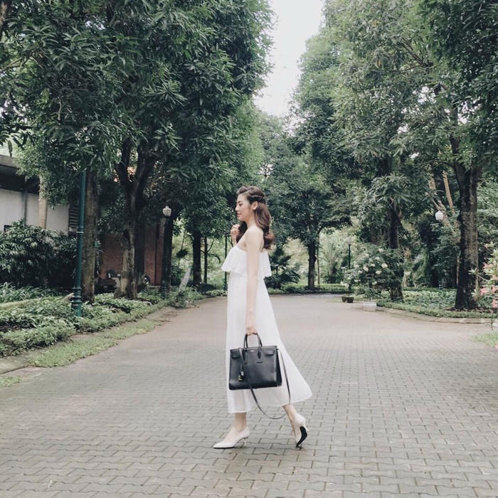 Đi theo phong cách dịu dàng và nữ tính nên không có gì khó hiểu khi cô thường xuyên diện những chiếc váy xòe bay bổng, mềm mại. Giày cao gót sắc trắng tiệp màu trang phục càng tăng thêm vẻ tinh khôi cho ngoại hình. Bên cạnh đó, chiếc túi xách đen chính là điểm nhấn sang trọng.