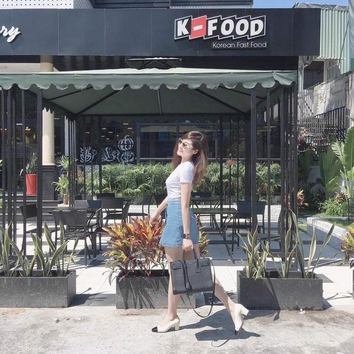 Ngoài những món đồ "bánh bèo" thì "người yêu tin đồn" Noo Phước Thịnh còn ưu tiên các trang phục năng động như chân váy jeans một hàng cúc mang hơi thở cổ điển đi cùng áo thun basic và giày gót vuông.