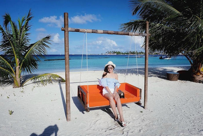 Chiếc áo trễ vai gợi cảm phối với quần short giúp người đẹp khoe nước da trắng nõn và đôi chân dài khi đi biển.