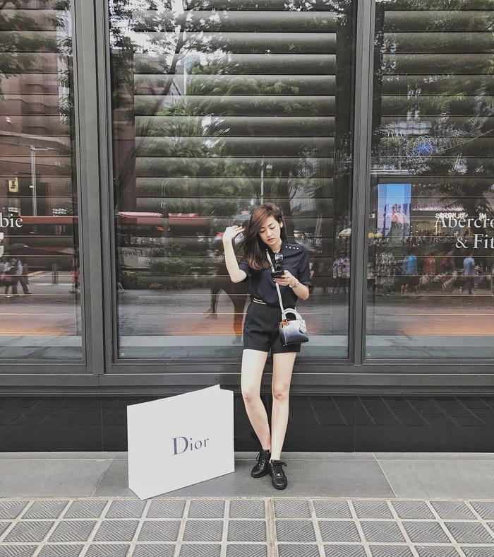 Chiếc túi Dior nhỏ xinh chính là điểm nhấn đắt giá cho set đồ đen năng động của Tú Anh.