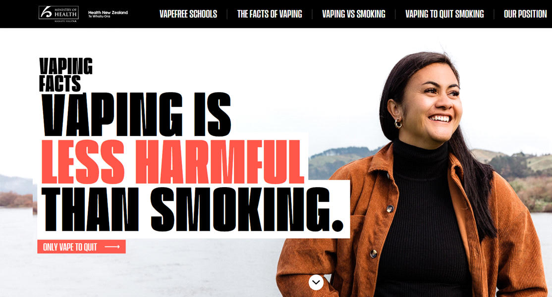 Trang web của Bộ Y tế New Zealand ghi rõ thông điệp:“Sử dụng thuốc lá điện tử ít có hại hơn hút thuốc lá điếu”. |