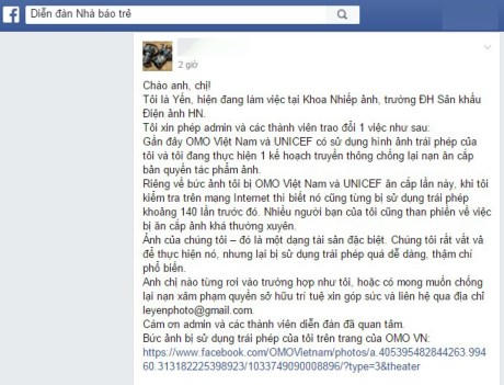 Dưới đây là nguyên văn nội dung của status tố OMO Việt Nam và UNICEF ăn cắp ảnh được nhiều quan tâm và chia sẻ: