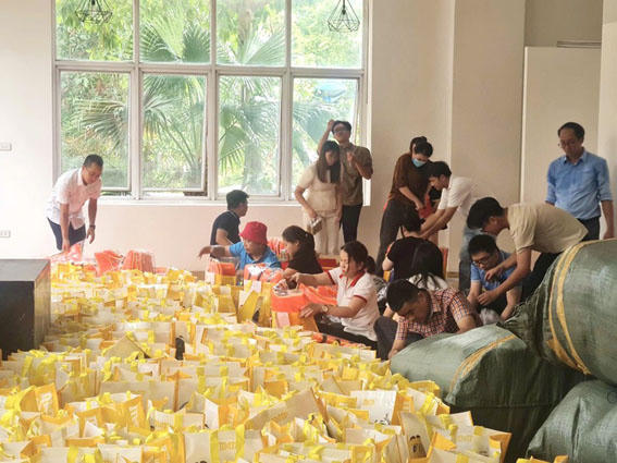 Đội ngũ nhà báo, phóng viên, người lao động Báo Pháp luật Việt Nam đóng gói từng phần quà gửi đến đồng bào vùng lũ. (Ảnh: Lê Hanh) |