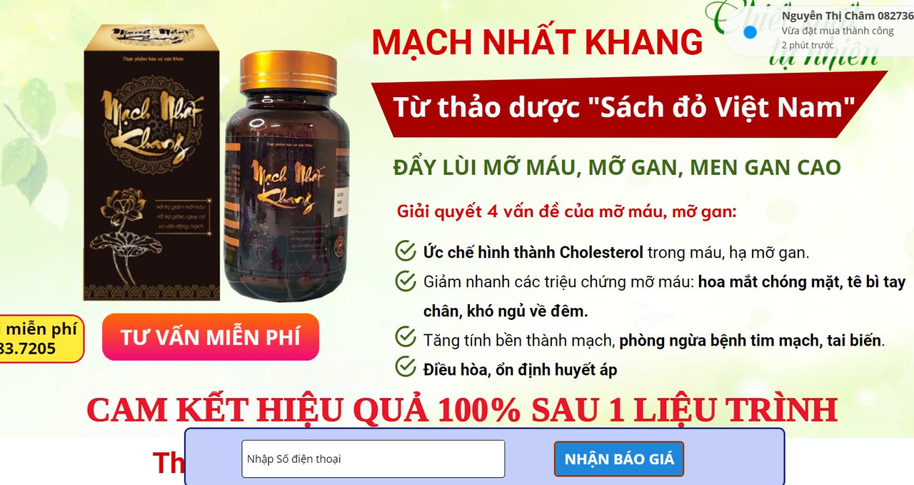 Tại website https://www.suckhoe-giadinh.online/mo-mau Mạch Nhất Khang được quảng cáo là sản phẩm được chiết xuất từ các thảo dược “Sách đỏ Việt Nam” với những công dụng đẩy lùi mỡ máu, mỡ gan, men gan cao. Đồng thời “cam kết hiệu quả 100% sau 1 liệu trình” và sử dụng rất nhiều hình ảnh thư tín, lời cảm ơn của khách hàng nhằm khẳng định hiệu quả của việc sử dụng sản phẩm.