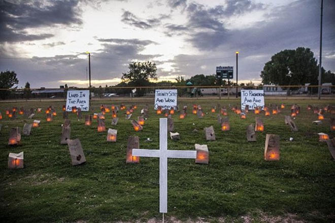 | Thắp nến ở Tulurosa, New Mexico tưởng niệm những người đã qua đời vì ung thư hoặc có liên quan đến phơi nhiễm bức xạ trong vụ nổ Trinity |