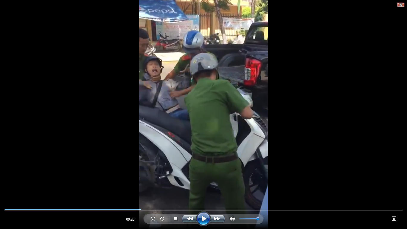 Lực lượng Công an sau nhiều lần yêu cầu người đàn ông xuống xe để làm việc nhưng không được sự hợp tác đã tiến hành khống chế. Một trong ba người khống chế ở cổ khiến người đàn ông trên xe SH ngã xuống đường. Người này liên tục nằm dưới đất hô hoán và kêu cứu: “Giết người, bà con ơi cứu tôi”. Tuy nhiên, khi chiếc xe SH chuẩn bị được đưa lên xe chuyên dụng, người này đứng lên giữ lại.