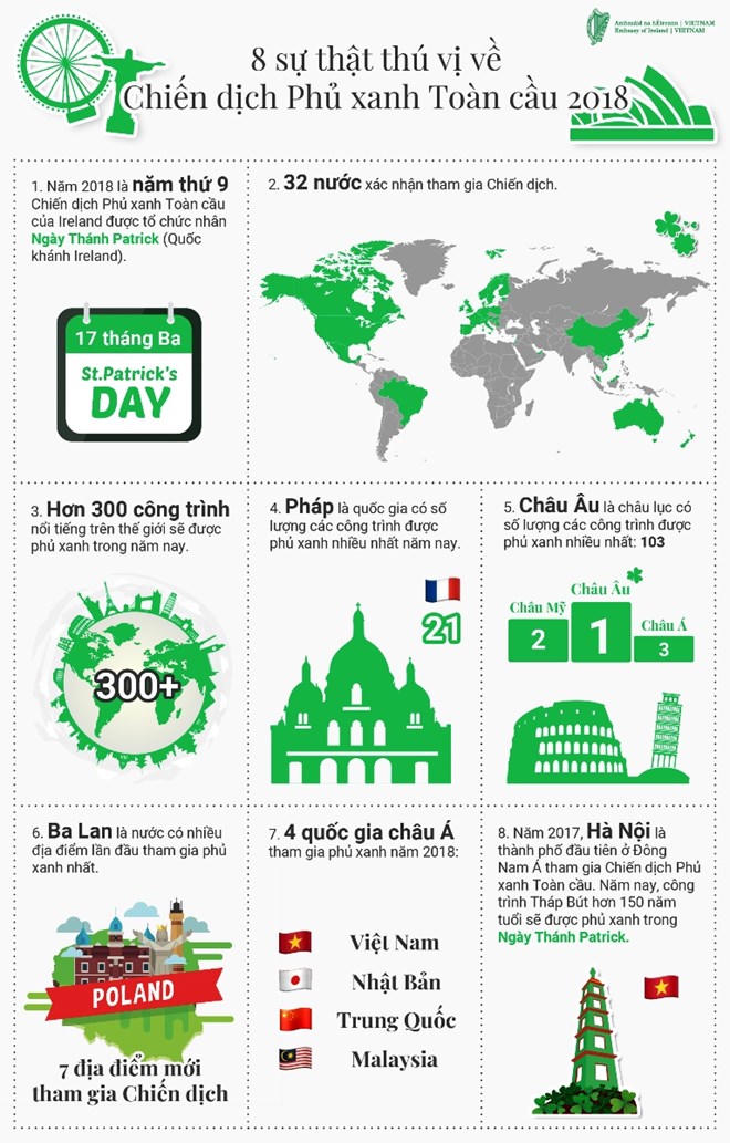 Theo VietNam+, trong ngày lễ thánh Patrick năm nay, Tháp Bút tại Hồ Gươm cùng hơn 300 địa danh nổi tiếng ở 32 quốc gia trên toàn thế giới, như tòa nhà Empire State ở New York, tòa Thị chính ở London, Vạn lý trường thành ở Trung Quốc sẽ chuyển màu xanh.