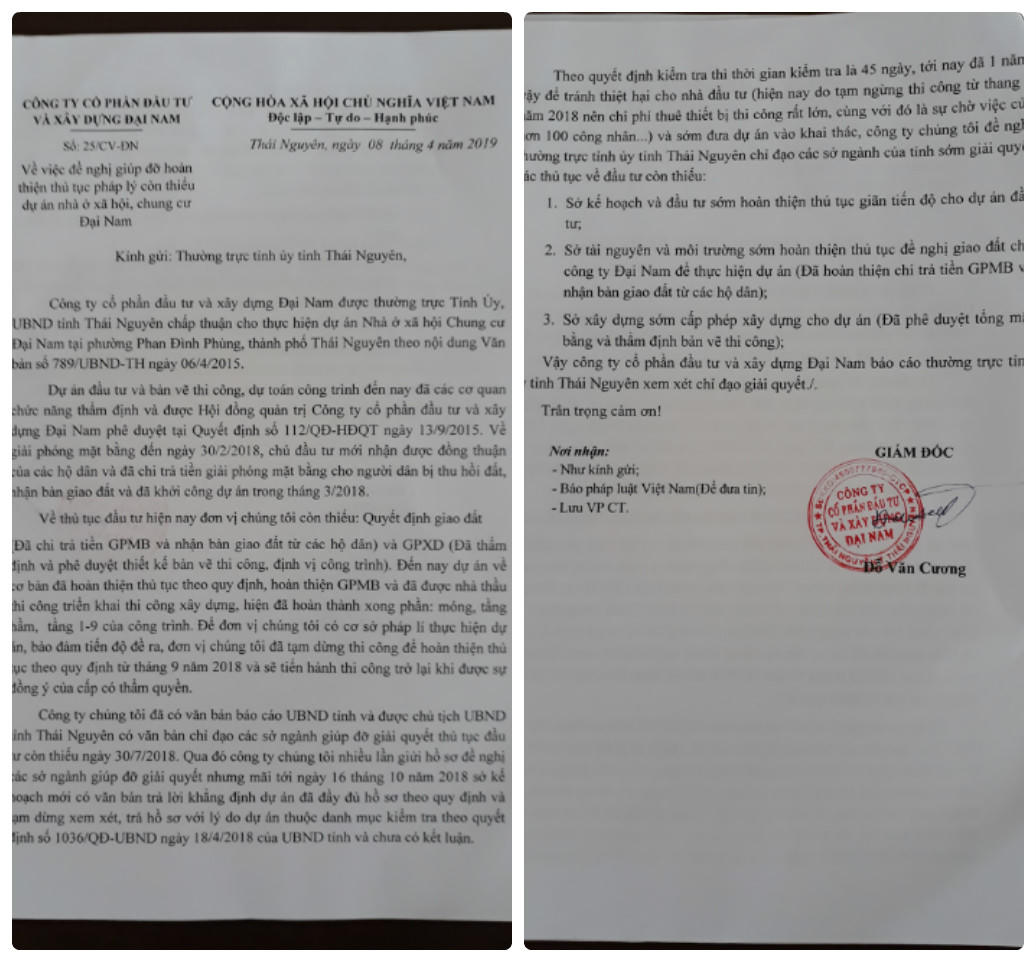 Để giải quyết vấn đề này, mới đây Cty CP Đầu tư và Xây dựng Đại Nam đã có Công văn số 25/CV-ĐN gửi lãnh đạo tỉnh Thái Nguyên về việc đề nghị giúp đỡ hoàn thiện thủ tục pháp lý còn thiếu Dự án nhà ở xã hội - Chung cư Đại Nam. Theo văn bản này, phía Cty Đại Nam đã có văn bản báo cáo UBND tỉnh và được Chủ tịch UBND tỉnh Thái Nguyên có văn bản chỉ đạo các sở ngành giúp đỡ giải quyết thủ tục đầu tư còn thiếu ngày 30/7/2018.