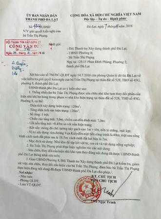 Đến ngày 9/11/2016, Đội Thanh tra xây dựng và UBND phường 8 bất ngờ nhận được Văn bản số 4724/UBND của UBND TP Đà Lạt do Phó Chủ tịch Võ Ngọc Trình ký ngày 7/11/2016 về việc giải quyết kiến nghị của bà Phụng, do 2 nhân viên cơ quan Thanh tra TP Đà Lạt trực tiếp mang đến. Theo văn bản này, UBND TP Đà Lạt cho phép bà Phụng xây dựng một nhà kho diện tích 120m2 tại thửa đất 528, tờ bản đồ 45G, đường Vạn Kiếp, phường 8 (Đà Lạt).