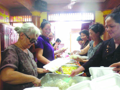 Tham gia công tác từ thiện tại chùa Tâm Pháp đa phần là các phật tử trong đạo tràng Pháp Hoa, toàn các bà, các cụ từ 55 tuổi trở lên nhưng mỗi lần vào bếp là mỗi lần được đón nhận những niềm vui và nụ cười rôm rả nên gần như mọi người đều chờ đến trưa ngày thứ 3, thứ 5 hàng tuần để cùng nhau vào bếp.