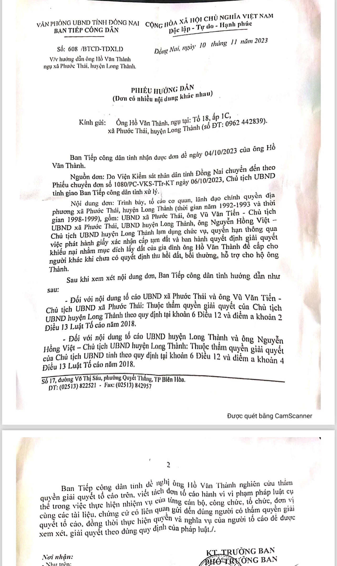 Tiếp đó, Ban Tiếp công dân tỉnh Đồng Nai nhận định với nội dung tố cáo ông Vũ Văn Tiến, nguyên Chủ tịch UBND xã Phước Thái, thuộc thẩm quyền giải quyết của Chủ tịch UBND huyện Long Thành theo khoản 6 Điều 12 và điểm a khoản 2 Điều 13 Luật Tố cáo 2018. Với nội dung phản ánh với ông Nguyễn Hồng Việt, nguyên Chủ tịch UBND huyện Long Thành; thì thẩm quyền giải quyết của Chủ tịch UBND tỉnh theo khoản 6 Điều 12 và điểm a khoản 4 Điều 13 Luật Tố cáo 2018. Ban Tiếp Công dân tỉnh đề nghị ông Thành viết tách đơn phản ánh hành vi vi phạm cụ thể trong việc thực hiện nhiệm vụ của từng cán bộ, công chức, tổ chức, đơn vị; gửi đến đúng người có thẩm quyền giải quyết.